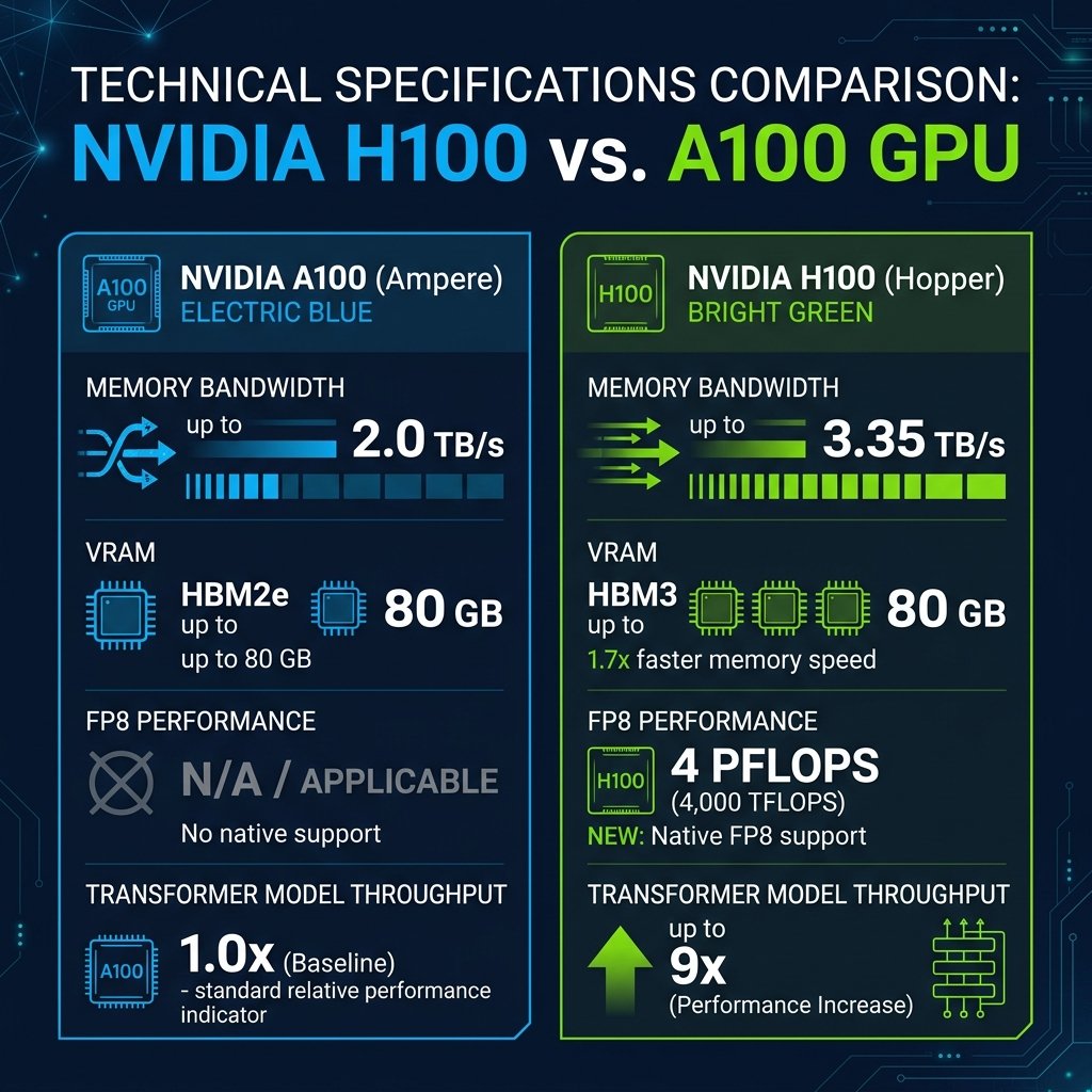 For transformer inference — particularly with long context windows — memory bandwidth is often the primary bottleneck, not raw FLOPS. The H100’s 3.35 TB/s vs the A100’s 2.0 TB/s creates a 67% advantage in memory-bound workloads. This directly translates to higher tokens/second throughput during inference, especially for large-context requests (32K+ tokens).
